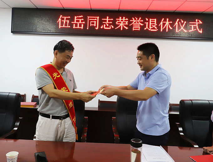 儀式上,董事長陽文林為伍岳同志佩戴了“光榮退休”綬帶,頒發(fā)了“光榮退休”紀念牌,并代表集團公司向伍岳同志為萬寶投各項事業(yè)發(fā)展所作出的貢獻表示崇高的敬意和衷心的感謝?偨(jīng)理徐業(yè)波傳達了相關文件精神,介紹了退休同志有關情況,回憶曾經(jīng)與伍岳同志共同奮斗的情誼和榮耀。工會代表在座談會上表達了感恩與不舍的心情,并送上了溫馨的祝福。