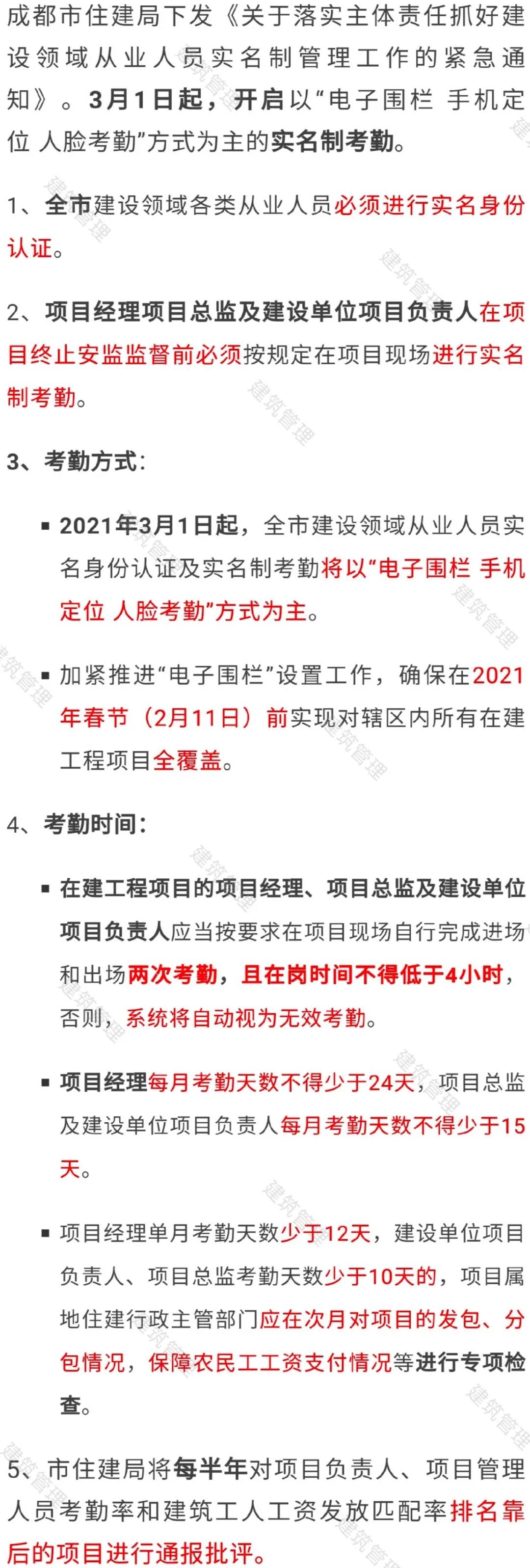 (四)關(guān)鍵崗位人員通過施工現(xiàn)場的“建筑工人實名制管理”考勤設(shè)備進行人臉識別方式考勤。關(guān)鍵崗位人員考勤信息按月統(tǒng)計,在系統(tǒng)留存時間至竣工驗收后至少3年,作為企業(yè)信用評價和評優(yōu)評先的依據(jù)。