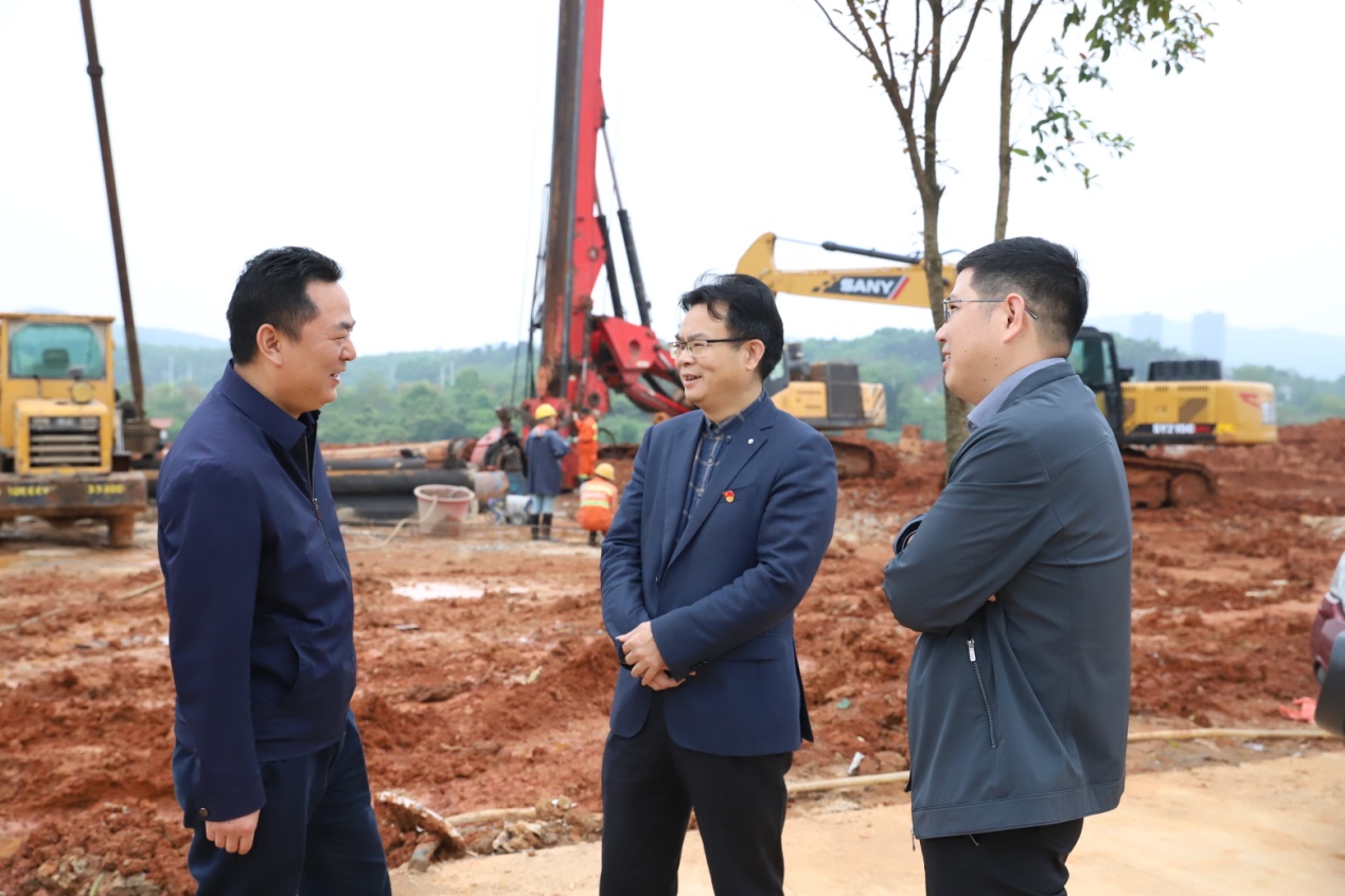 萬寶投資集團(tuán)董事長梁養(yǎng)賢(中)、總經(jīng)理徐業(yè)波(右),與項目所在地婁星區(qū)萬寶鎮(zhèn)負(fù)責(zé)人現(xiàn)場溝通對接
