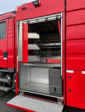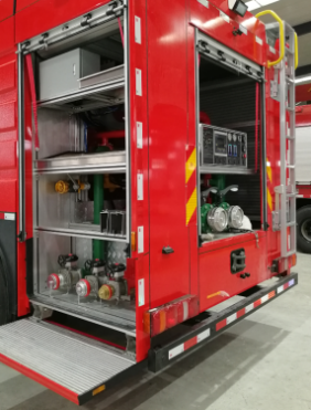 3.2 | 儲物箱:車輛設有(5個)防水、防塵的鋁合金卷簾門,卷簾門觸發(fā)電磁傳感器自動開關LED照明;在兩側卷簾門下方設有翻轉腳踏板,踏板行程由氣彈簧控制,踏板由整塊特制高強度鋁型材裁剪并與附件無焊接組裝而成、站立面防滑,每個踏板可稱重靜載荷200kg,便于取放儲物箱內(nèi)器材;儲物箱內(nèi)科學合理放置各類器材,固定牢靠、取放便捷。 |